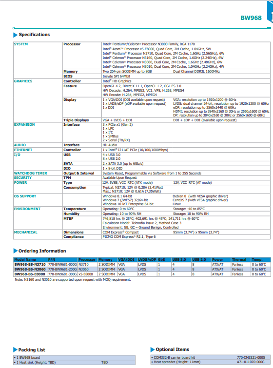 产品分类:COMe模块Intel® Pentium® N30001、双通道 DDR3L 1600MHz SODIMM 至8GB2、三重独立显示: VGA*/DDI + LVDS*/eDP + DDI3、多重扩充讯号: 3 PCIe x1, 1 LPC, 1 I2C, 1 SMBus4、丰富 I/O: 1 Intel 网口, 4 USB 3.0, 8 USB 2.05、15年CPU长期支持至Q1' 30 (Based on Intel IOTG Roadmap)