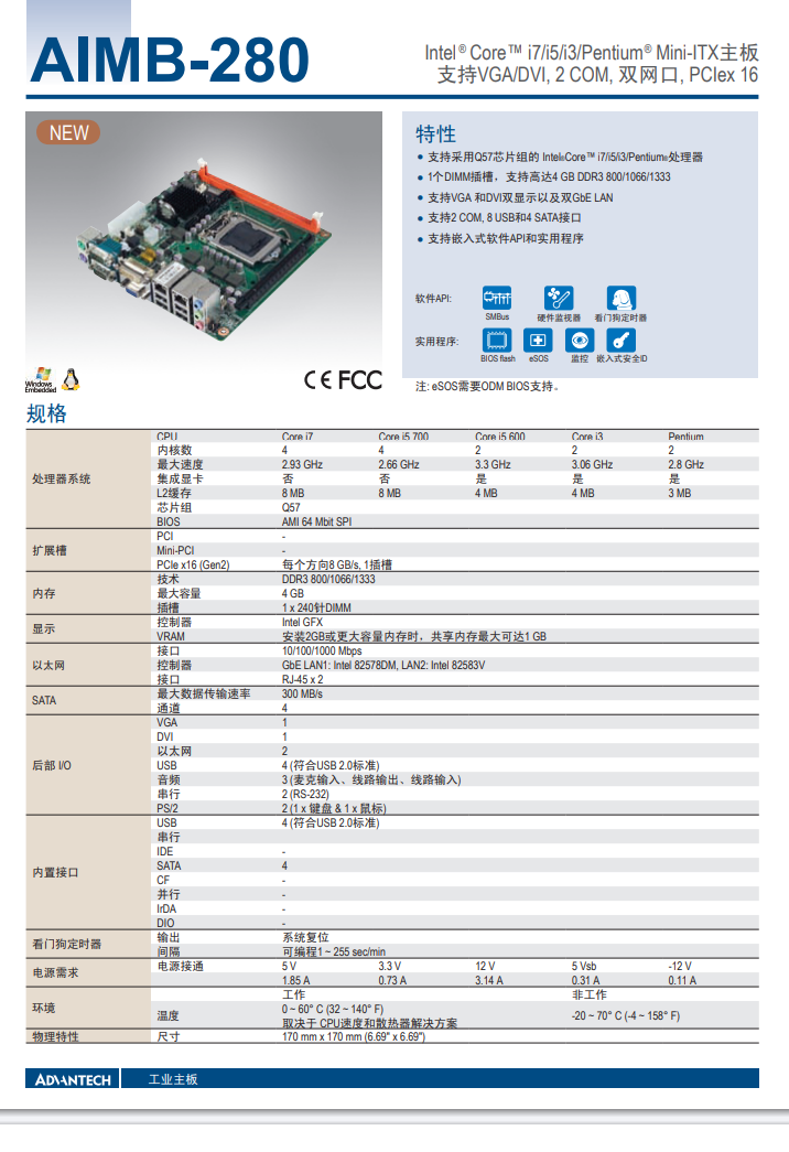 AIMB-280 A101-4 19A6028003 Intel ® Core™ i7/i5/i3/Pentium® Mini-ITX主板支持VGA/DVI, 2 COM, 双网口, PCIex 16