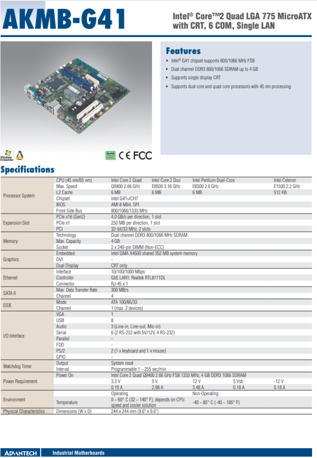 AKMB-G41M REV.A1 AKMB-G41MF-00A1E Intel® Core™2 Quad LGA 775 MicroATXwith CRT, 6 COM, Single LAN