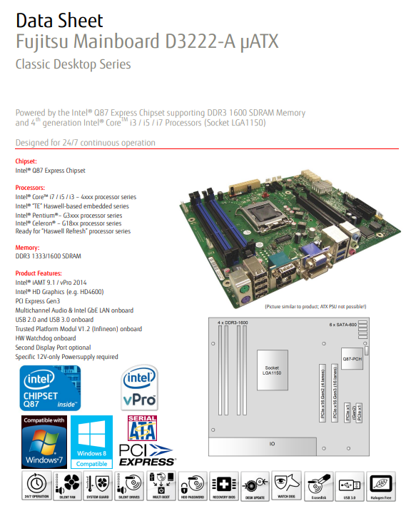 Powered by the Intel® Q87 Express Chipset supporting DDR3 1600 SDRAM Memoryand 4th generation Intel® CoreTM i3 / i5 / i7 Processors (Socket LGA1150)Designed for 24/7 continuous operation
