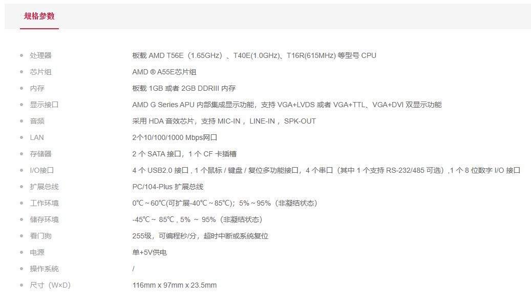 产品分类:CPU主板1、板载AMD T56E、T40E、T16R 等型号 CPU2、板载1GB 或者2GB DDRIII内存3、2个10/100 Mbps以太网控制器4、支持VGA+LCD或者VGA+LVDS显示