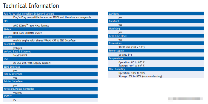 产品分类:CPU主板1、Extreme low power fanless PC/104plus, 500MHz AMD LX8002、 With onchip Graphics VRAM for high speed LCD/CRT3、C/104plus card for ISA and PCI IO card expansion4、OHS compliant FULL Featured embedded SBC (USB, COM, LAN, ect)