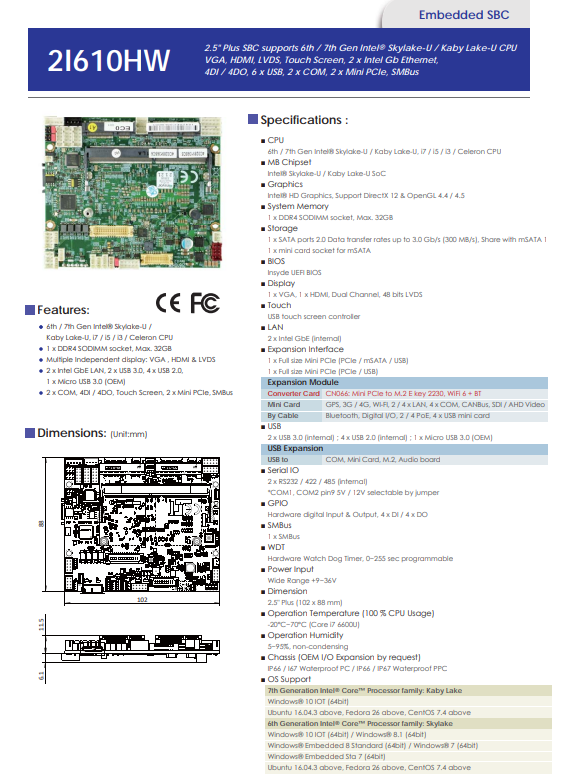 5、2 x COM, 4DI / 4DO, Touch Screen, 2 x Mini PCIe, SMBus