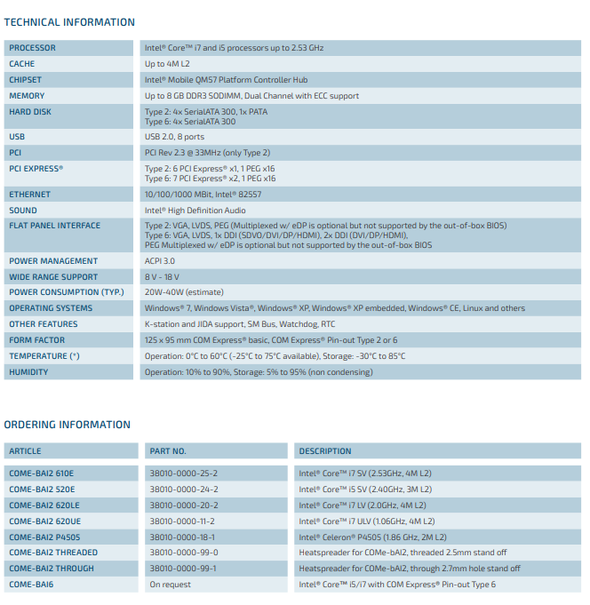 产品分类:COMe模块1、processor performance up to Intel® Core™ i7 SV (2.53GHz)2、 up to 8GB DDR3 memory with ECC3、pporting VGA, LVDS and 3x DDI