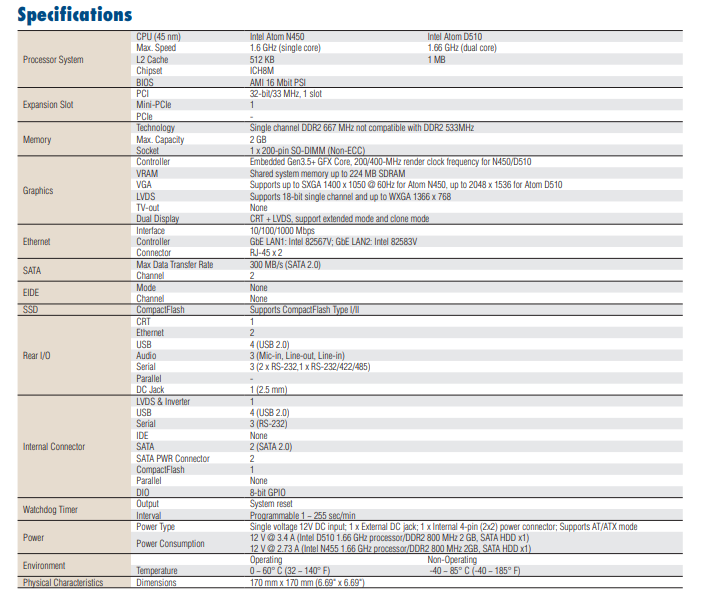 1、Supports Intel® Atom™ processor N450 and D510 dual core