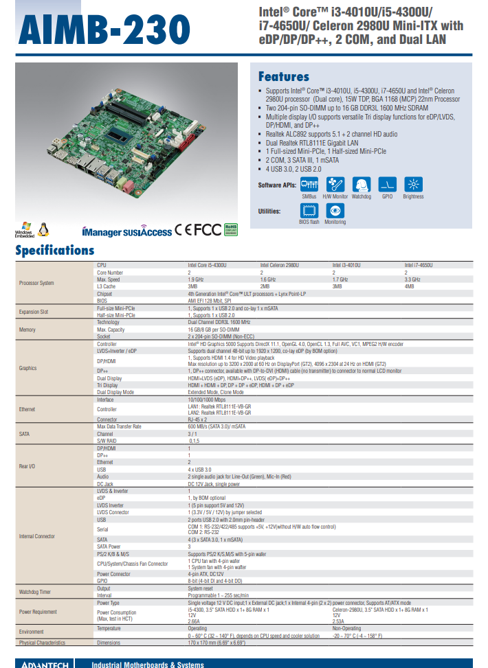 1、Supports Intel® Core™ i3-4010U, i5-4300U, i7-4650U and Intel® Celeron2980U processor (Dual core), 15W TDP, BGA 1168 (MCP) 22nm Processor