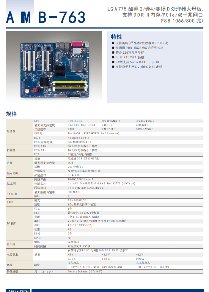 AIMB-763 REV A1 08GS19A945G206 EPS0158176 LGA775 酷睿 2/奔4/赛扬 D处理器大母板,支持 DDR II 内存/PCI e/双千兆网口(FSB 1066/800 兆)