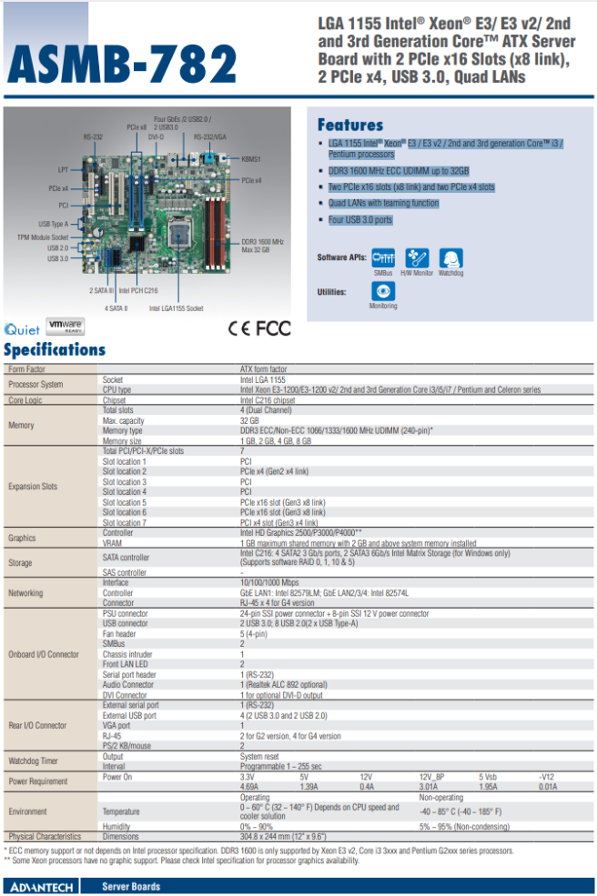 产品分类:COMe模块1、LGA 1155 Intel® Xeon® E3 / E3 v2 / 2nd and 3rd generation Core™ i3 /Pentium processors2、DDR3 1600 MHz ECC UDIMM up to 32GB3、Two PCIe x16 slots (x8 link) and two PCIe x4 slots4、Quad LANs with teaming function5、Four USB 3.0 ports