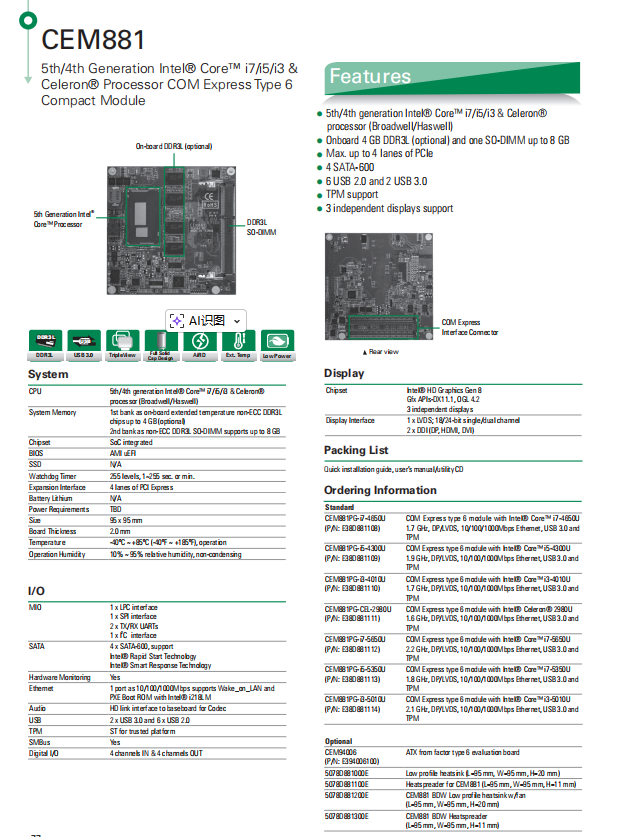 CEM881 4th/5th Generation Intel® CoreTMProcessor COM ExpressTM Type 6Compact Module