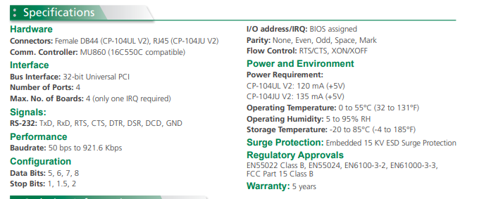 产品分类:COMe模块1、超过 800 kbps 的高效数据吞吐量2、 串口传输速率最高可达 921.6 kbps3、128-byte FIFO 和芯片集成的 H/W、S/W 流量控制4、 兼容 3.3/5 V PCI 和 PCI-X 5、支持多种操作系统驱动程序,包括 Windows、Linux 和 UNIX6、 -40 至 85°C 宽温型号可选