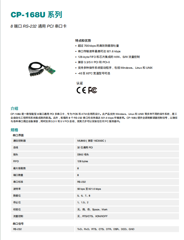 产品分类:COMe模块1、超过 700 kbps 的高效数据吞吐量2、 串口传输速率最高可达 921.6 kbps3、 128-byte FIFO 和芯片集成的 H/W、S/W 流量控制4、 兼容 3.3/5 V PCI 和 PCI-X5、 支持多种操作系统驱动程序,包括 Windows、Linux 和 UNIX6、-40 至 85°C 宽温型号可选