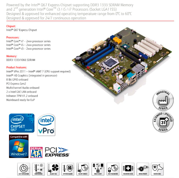 Powered by the Intel Q67 Express Chipset supporting DDR3 1333 SDRAM Memoryand 2 generation Intel Corei3/i5 /i7 Processors (Socket LGA1155)Designed & approved for enhanced operating temperature range from 0°C to 60°CDesigned & approved for 24/7 continuous operation