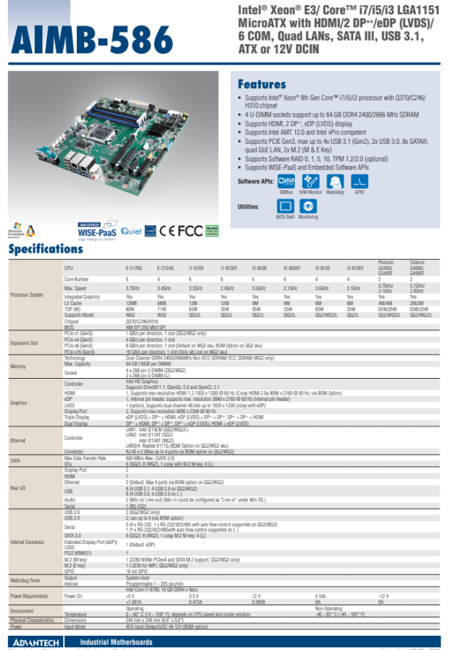 4、支持PCIE Gen3,4 个 USB 3.1,4 x USB 3.1(Gen 2),2 x USB 3.0,8 x SATA III ,4 x GbE LAN,2 x M.2(M+E key)