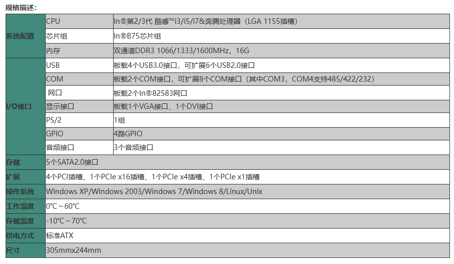 产品分类:ATX主板产品特性:1、In®第2/3代 酷睿™i3/i5/i7&奔腾处理器(LGA 1155插槽)2、In®B75芯片组3、双通道DDR3 1066/1333/1600MHz,16G4、5个SATA2.0接口、6个USB2.0接口、4个USB3.0接口、10个COM接口、1个VGA接口、1个DVI接口、1个PS/2接口、2个RJ-45接口、3个音频插孔5、4个PCI插槽、1个PCIe x16插槽、1个PCIe x4插槽、1个PCIe x1插槽