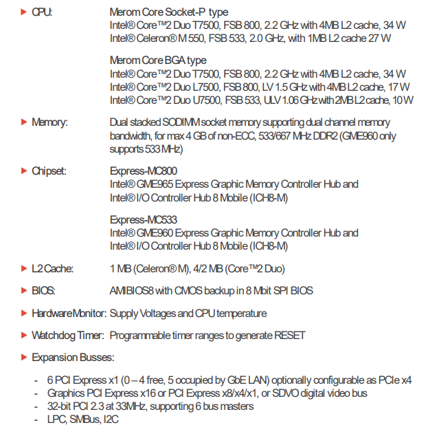 产品分类:COM-Express Basic (125x95 mm)Intel® Core™2 Duo处理器(最大至2.2 GHz)1、面向嵌入式应用的Intel® GME965/ICH8M芯片组2、支持4 GB 800MHz DDR2 SODIMM3、可外扩充5个PCIe x1总线及1个PCIe x16(或x8)高速图像总线4、支持双通道24位LVDS显示,并支持视频输出5、SATA-300, PATA,千兆以太网,USB 2.0