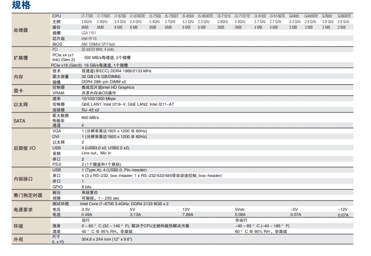 产品分类:工业级母板1、Intel®第六/七代Core™ i7/i5/i3/Pentium®/Celeron®处理器2、双通道 DDR4 1866/2133 ,高达32GB3、 支持VGA和DVI显示 支持SATA3.0, USB3.0, 双GbEs4、 支持5个RS-232和1个RS-232/422/485串联端口4、 1个PCIe x16 (Gen3)和2个PCIe x4 (x1 link), 和4个PCI 扩展口
